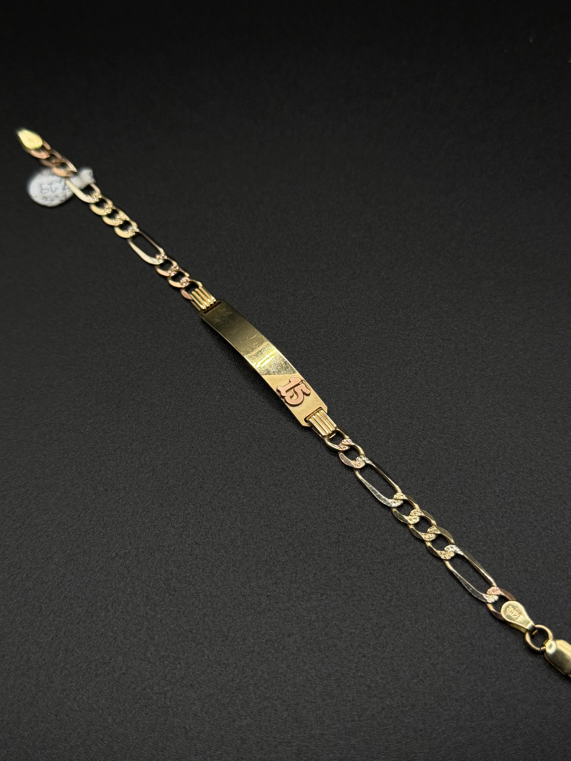 ID Bracelet with a 15 in Rose Gold and 3 Tone Diamond Cut Figaro Links
